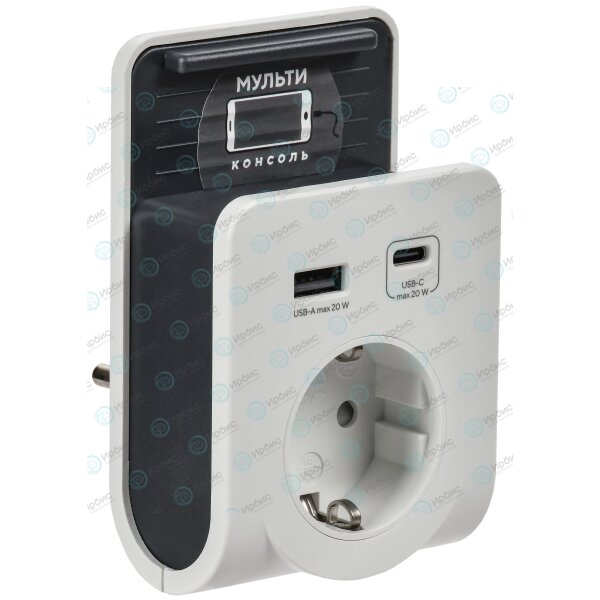 Адаптер Т-03/01 1 место 2P+PE 16А 2хUSB A+C 20Вт с подставкой бело-черный IEK