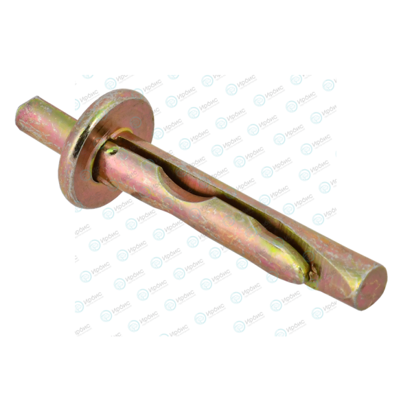 Область применения: монтаж уголков, пластин, реек и перфоленты. Материал основания: полнотелый кирпич, бетон, природный камень. Конструкция: состоит из шпильки, оснащенной стопорной шляпкой, и клина. Шпилька имеет проточку под клин и утолщение на конце. При забивании клин продвигается вдоль шпильки и входит в утолщение, благодаря чему создается эффект расклинывания. Способ установки: сквозной монтаж. Материал анкера: углеродистая сталь. Покрытие: Гальваническое с дополнительной пассивацией желтого цвета. Особенности: устанавливается в предварительно просверленное отверстие в прикрепляемом материале и основании, забивается молотком. Рекомендуется для быстрого подвешивания кабеленесущих систем и вентиляции с использованием перфорированной ленты.