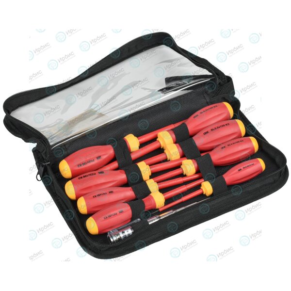 Набор диэлектрических отверток серии К3 рассчитан на использование под напряжением до 1000В. Набор включает в себя: крестообразные отвертки PH1x80, PH2х100, PZ1x80, PZ2x100; шлицевые - SL2,5х75, SL4,0х100, SL5,5х125, SL6,5х150 и отвертку-пробник ОП-1.