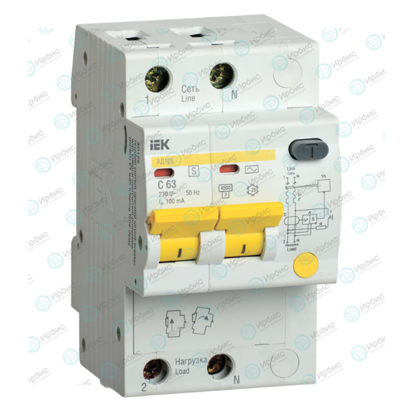 Автомат дифференциальный АД12S 2Р 63А 100мА, IEK MAD13-2-063-C-100