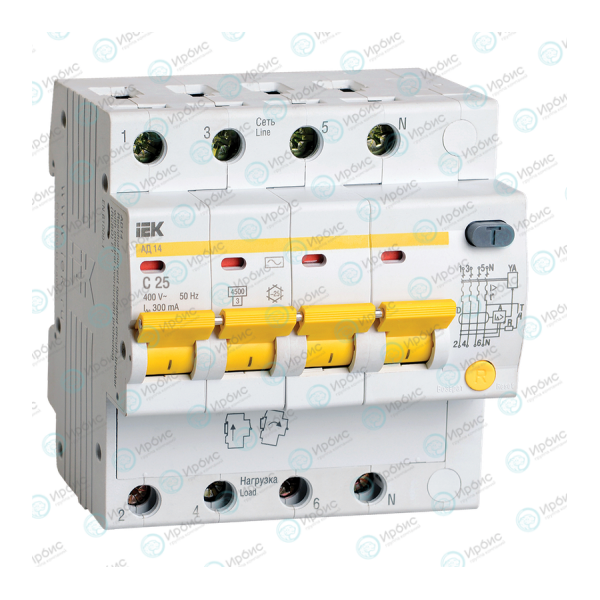 Автомат дифференциальный АД14 4Р 25А 300мА, IEK MAD10-4-025-C-300