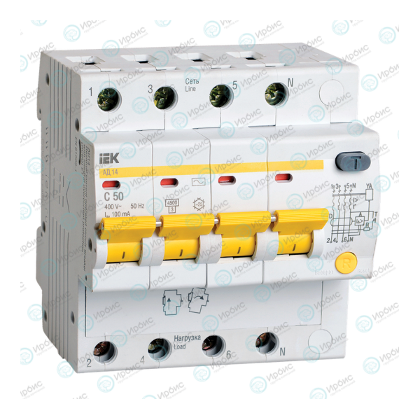 Автомат дифференциальный АД14 4Р 50А 100мА, IEK MAD10-4-050-C-100