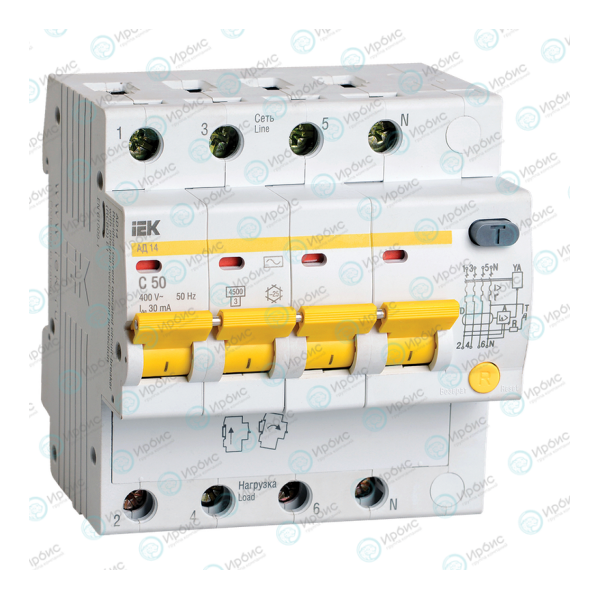Автомат дифференциальный АД14 4Р 50А 30мА, IEK MAD10-4-050-C-030