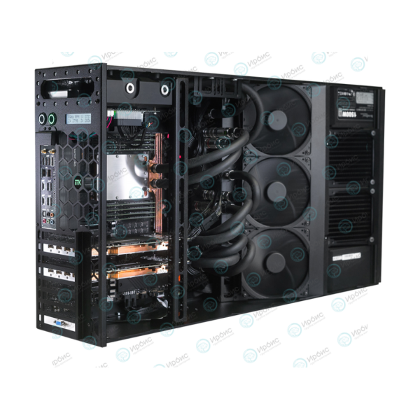 Промышленный сервер с системой жидкостного охлаждения ITK представляет собой комбинацию жидкостного охлаждения самых горячих элементов CPU, GPU, VRM опционально SSD, RAM и воздушного охлаждения для не сильно нагруженных элементов.