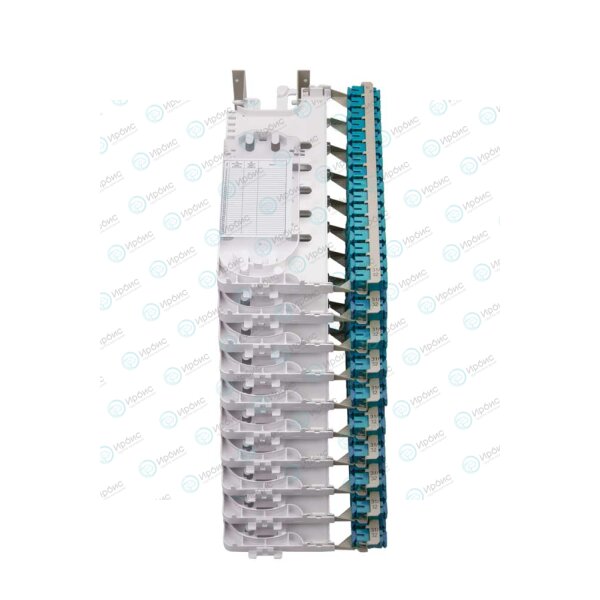 Конструктивной особенностью данного решения является монтаж и кросс-коммутация ОВ в откидных кроссовых модулях, объединенных в кроссовые блоки. Каждый модуль содержит кассету для укладки ОВ и панель с адаптерами (до 24 FC или 32 SC). В собранном состоянии модули размещаются в блоке вертикально, при этом адаптерные панели образуют кроссовое поле. При повороте модуля в горизонтальное положение обеспечивается удобный доступ к адаптерам и пигтейлам. Для монтажа модуль свободно снимается с блока за счет запаса длины транспортных трубок.