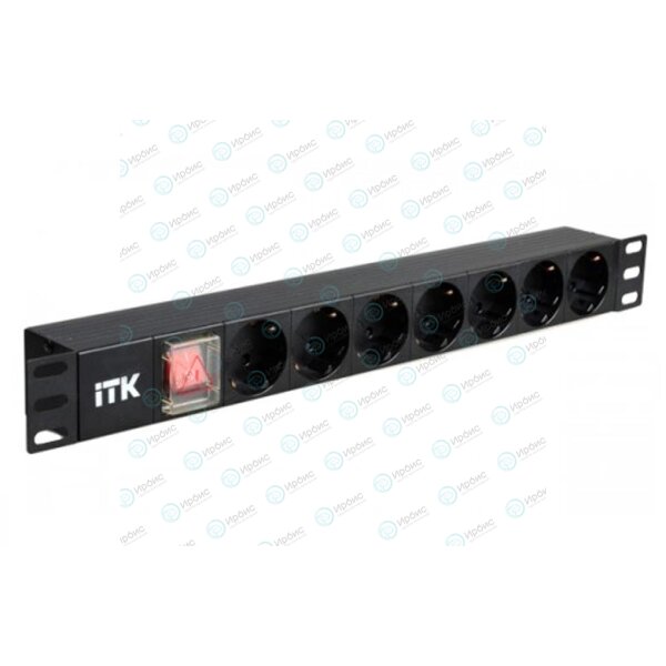 Блок розеток 19", 1U, 7 гнезд (Schuko), вход C14, 10A, с LED выкл., черный, без кабеля, ITK PH12-7D3