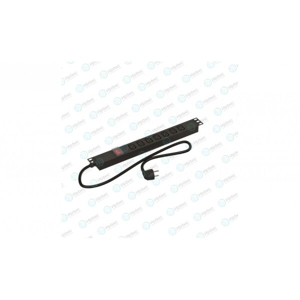 Hyperline SHE19-7IEC-S-2.5EU Блок розеток для 19" шкафов, горизонтальный, 7 розеток IEC320 C13, выключатель в подсветкой, кабель питания 2.5м (3х1.5мм2) с вилкой Schuko 16A, 250В, 482.6x44.4x44.4мм (ШхГхВ), корпус алюминий, черный