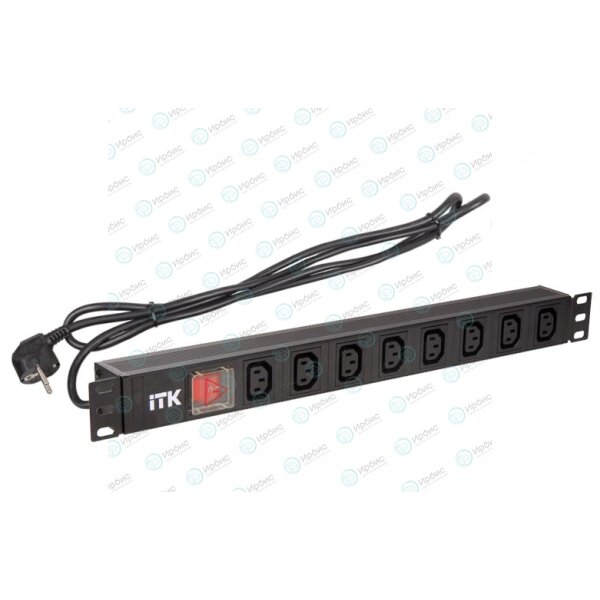Блок розеток 19", 1U, 8 гнезд (Schuko), вход C13, 16A, с LED выкл, черный, кабель 2м, ITK PH12-8C131