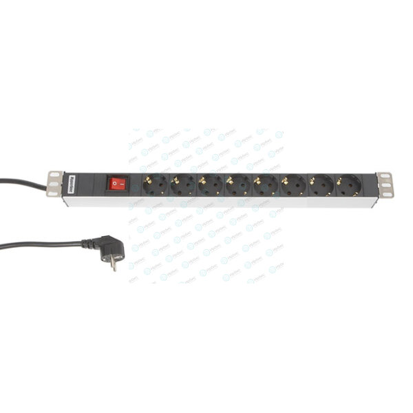 Блок розеток 19", 1U, 8 гнезд (Schuko), 16A, с LED выкл, чер, каб. 2,5м, Hyperline SHT19-8SH-S-2.5EU