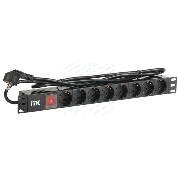 Блок розеток 19", 1U, 8 гнезд (Schuko), 16A, с LED выкл., черный, кабель 2м, ITK PH12-8D1-P