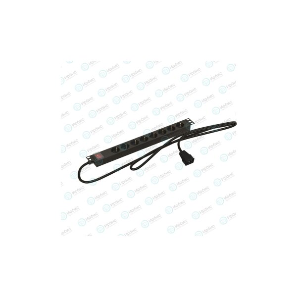 Hyperline SHE19-8SH-SR-2.5AIEC Блок розеток для 19" шкафов, горизонтальный, 8 розеток Schuko, 16A, 250В, выключатель с подсветкой, устройство защиты от перенапр. с инд., кабель питания 3х1.5мм2, длина 2.5м, вилка IEC 320 C20, 482.6x44.4x44.4мм (ШхГхВ)