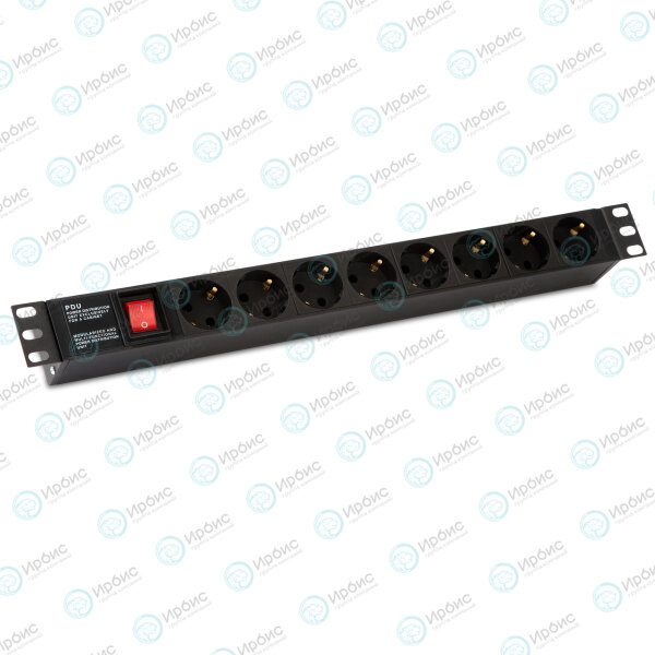 Блок розеток 19", 1U, 8 гнезд (Schuko), вход C14, 10А, с LED выкл, без каб, HL SHE19-8SH-S-IEC