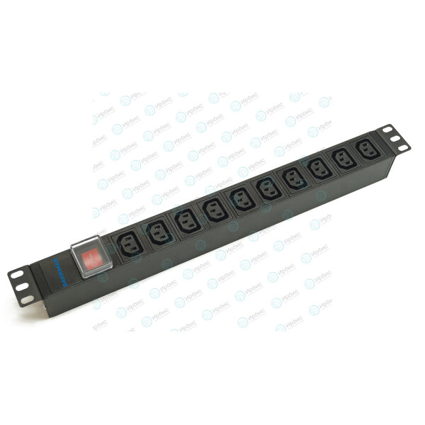 Блок розеток 19", 1U, 10 гнезд, вход C13, 10A, с LED выкл., черный, без кабеля, DANNMAN 7000220