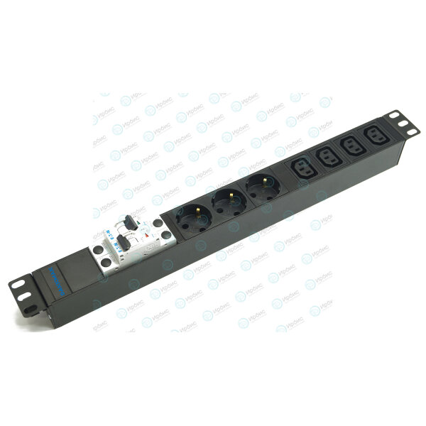 Блок розеток 19", 1U, 3 гнезда (Schuko)+4 гнезда, вход C13, 32A, черный, без кабеля, DANNMAN 7000730