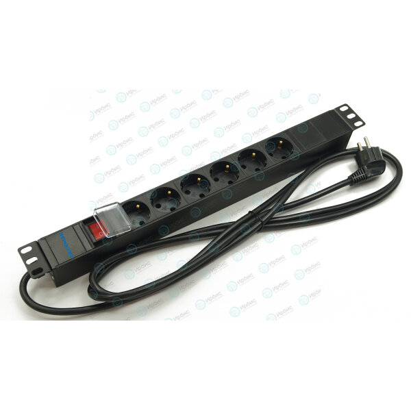 Блок розеток 19", 1U, 6 гнезд (Schuko), 16A, с LED выкл., черный, кабель 2,5м, DANNMAN 7000300