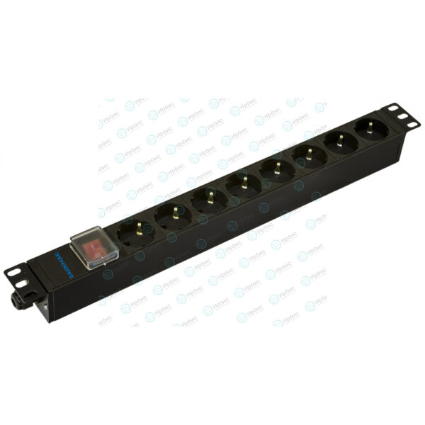 Блок розеток 19", 1U, 8 гнезд (Schuko), 16A, с LED выкл., черный, без кабеля, DANNMAN 7000390