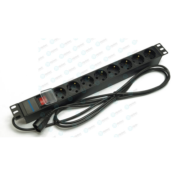 Блок розеток 19", 1U, 8 гнезд (Schuko), вход C14, 10A, с LED выкл., черн., каб. 2,5м,DANNMAN 7000380