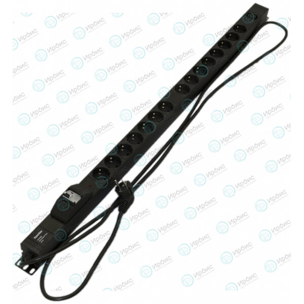 Hyperline SHE-15SH-1IEC-BF-2.5EU Блок розеток, вертикальный, 15 розеток Schuko, 1 розетка IEC320 C13, авт. выключатель, защита от перенапряжения, кабель питания 2.5м (3х1.5мм2) с вилкой Schuko 16A, 250В, 1040x44.4x44.4мм (ДхШхВ), корпус алюминий, черный