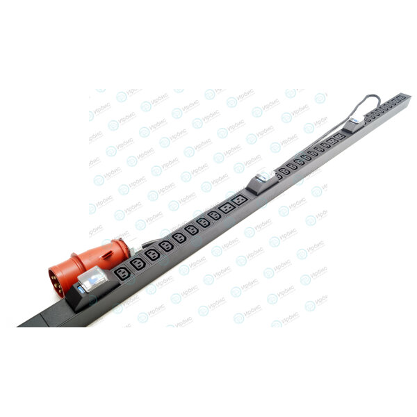 Hyperline SHE-24IEC-6BIEC-B-3x16-3PVR Блок розеток, вертикальный, 24 розетки IEC320 C13, 6 розеток IEC320 C19, автоматический выключатель, кабель питания 3м (5х4.0мм2) с вилкой IEC 60309 16А (3P+N+E), 380В, корпус алюминий, черный