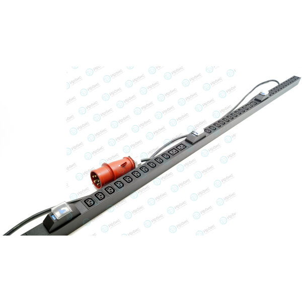 Hyperline SHE-30IEC-6BIEC-B-3x32-3PVR Блок розеток, вертикальный, 30 розеток IEC 60320 C13, 6 розеток IEC 60320 C19, автоматический выключатель, кабель питания 3м (5х4.0мм2) с вилкой IEC 60309 32А (3P+N+E), 380В, корпус алюминий, черный
