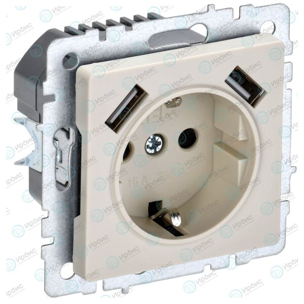 BRITE Розетка 1-местная с заземлением с защитными шторками 16А с USB A+A 5В 3,1А РЮш10-2-БрКр бежевы