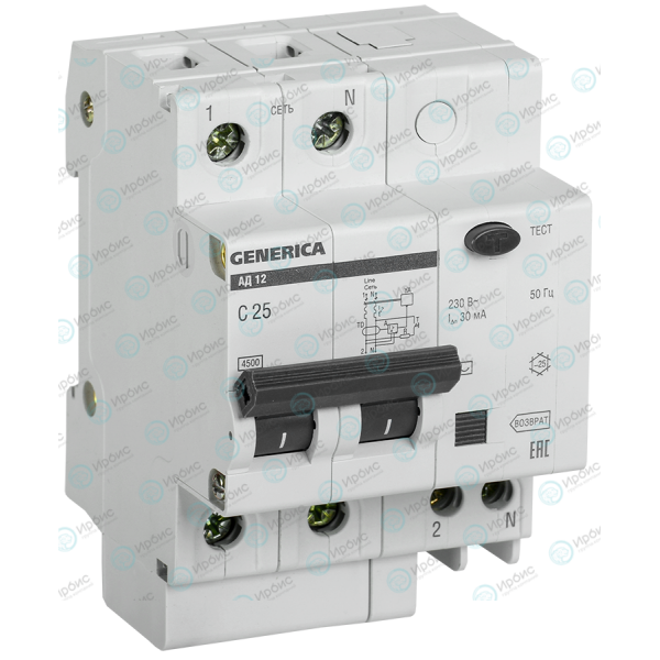 Выключатель автоматический дифференциальный АД12, 2Р, 25А, 30мА, GENERICA MAD15-2-025-C-030