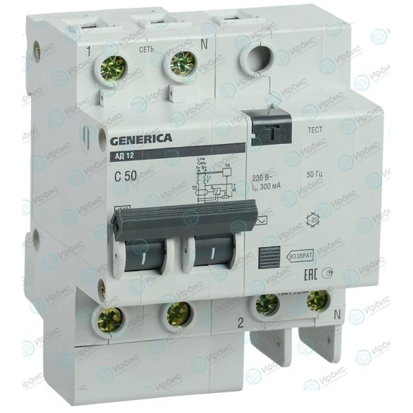 Выключатель автоматический дифференциальный АД12, 2Р, 50А, 300мА, GENERICA MAD15-2-050-C-300