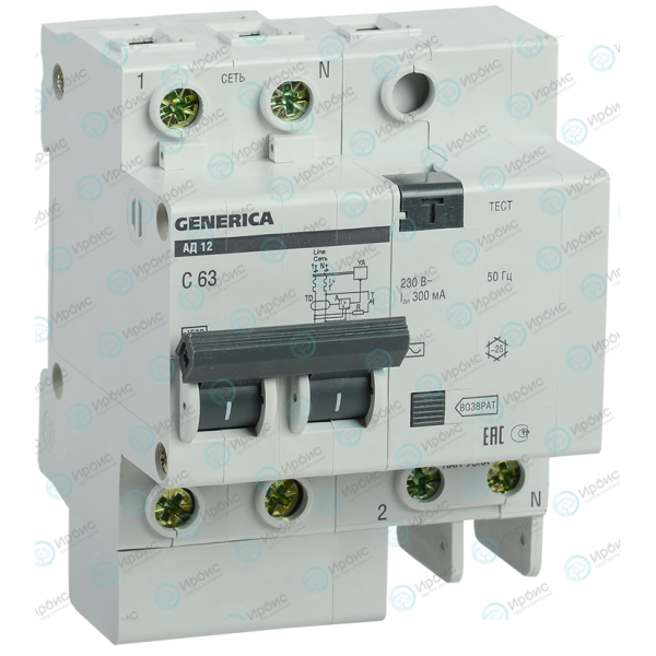 Выключатель автоматический дифференциальный АД12, 2Р, 63А, 300мА, GENERICA MAD15-2-063-C-300