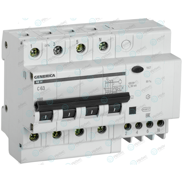 Выключатель автоматический дифференциальный АД14, 4Р, 63А, 30мА, GENERICA MAD15-4-063-C-030