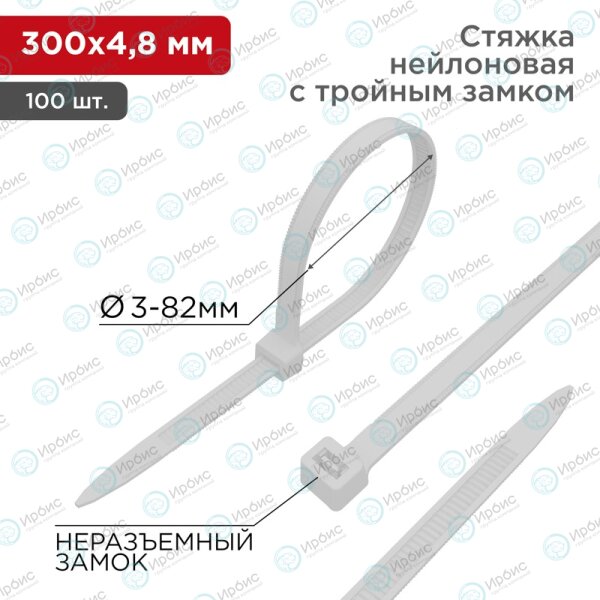 Хомут нейлоновый с тройным замком 300x4,8мм белого цвета позволяет зафиксировать провода, кабели и трубы в необходимом положении, собрать их в жгут, прикрепить к какому-либо основанию. Изделия имеют широкую область применения, в связи с чем используются во многих сферах жизнедеятельности и в быту. Данный вид стяжек на 30% прочнее своих аналогов, так как оснащен двусторонним полотном с зубчиками и новым замком с тремя точками контакта. Приспособления изготавливаются из полиамида 6,6 –кристаллизующегося материала, имеющего высокую твердость и механическую прочность.
