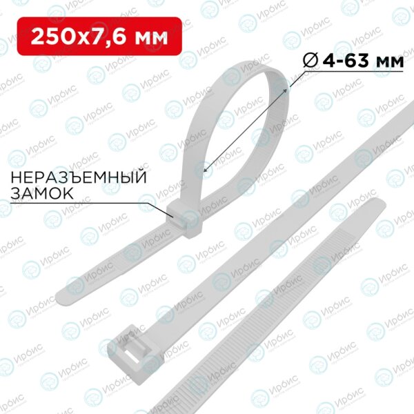 Нейлоновый хомут (кабельная стяжка) 250x7,6мм белого цвета – простое и экономичное фиксирующее приспособление, применяемое для того, чтобы аккуратно организовать разбросанные на полу или свисающие под потолком провода/кабели, а также привести в порядок спутанные провода в распределительных шкафах. Использование стяжек в быту позволяет соединять детали конструкций, связывать вместе предметы, подвязывать растения и многое другое. Изделия, изготавливаемые из полиамида 6,6 (нейлон), просты в использовании. Для того чтобы установить хомут вручную необходимо совершить всего пару движений: вставить конец ленты в замок и затянуть. Существуют специальные монтажные инструменты REXANT, которые облегчают и ускоряют установку (арт.12-4521 или 12-4541). Отличительные свойства нейлоновых хомутов: высокая прочность на разрыв, пластичность, долгий срок службы, устойчивость к внешним факторам.