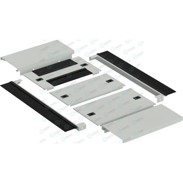 Используется для изолирования пространства в нижней части шкафа. Предотвращают попадание пыли во внутренне пространства шкафа а также повышают эффективность систем принудительного охлаждения. Элементы панели оснащены подпружиненными замками, что обеспечивает их простой и удобный монтаж без использования инструментов. Панель оснащена двумя щеточными вводами высокой емкости расположенными вдоль боковых частей шкафа, на всю глубину с суммарным окном просвета 480 см², плюс дополнительно, один из модулей панели оснащен щеточными вводами с суммарным окном просвета 1200/1500 см², при необходимости увеличения емкости кабельного ввода имеется возможность замены любого глухого модуля панели на модуль с щеточным вводом. Монтаж панели основания возможем уже после ввода кабеля в шкаф.