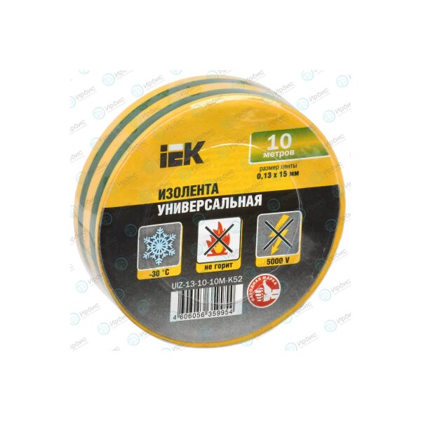 Изолента 0,13х15мм, 10м, желто-зеленая, IEK UIZ-13-10-10M-K52