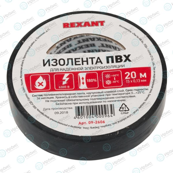 Изолента 0,13х15мм, 20м, черная, REXANT 09-2606