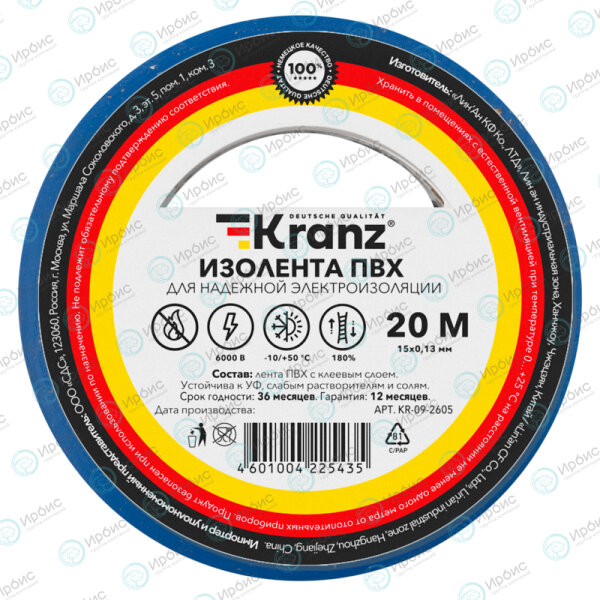 Изолента 0,13х15мм, 20м, синяя, KRANZ KR-09-2605