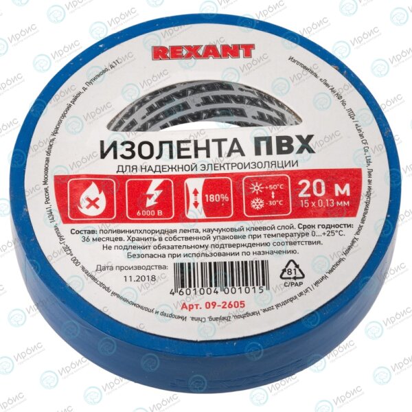 Изолента 0,13х15мм, 20м, синяя, REXANT 09-2605