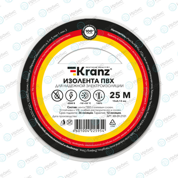 Изолента 0,13х15мм, 25м, белая, KRANZ KR-09-2101