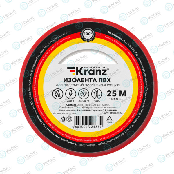 Изолента 0,13х19мм, 25м, красная, KRANZ KR-09-2204