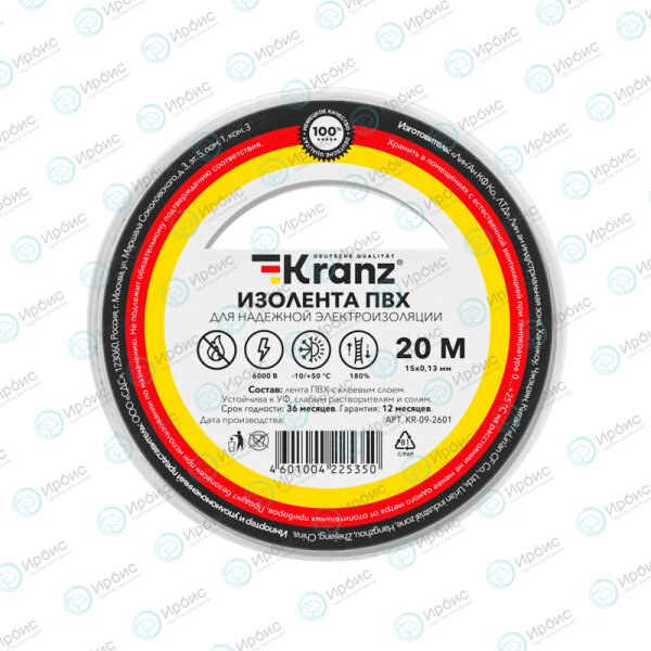 Изолента 0,13х15мм, 20м, белая, KRANZ KR-09-2601