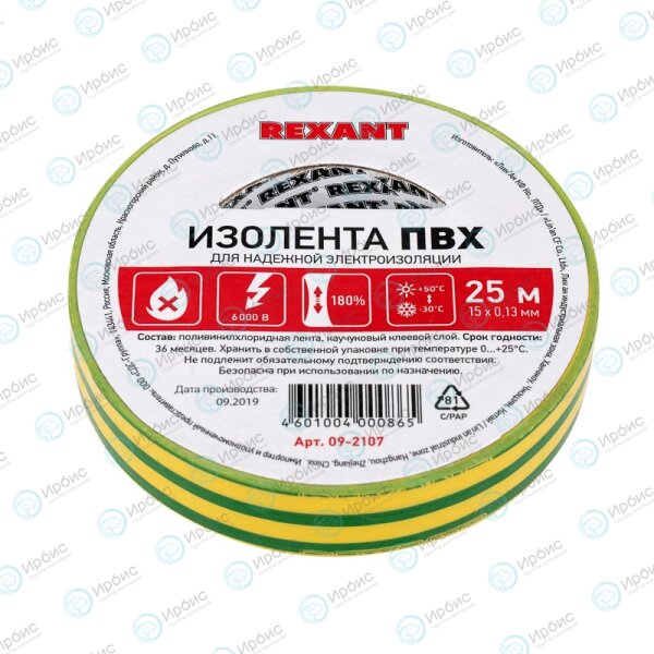 Изолента 0,13х15мм, 25м, желто-зеленая, REXANT 09-2107