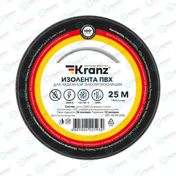 Изолента 0,13х19мм, 25м, черная, KRANZ KR-09-2206