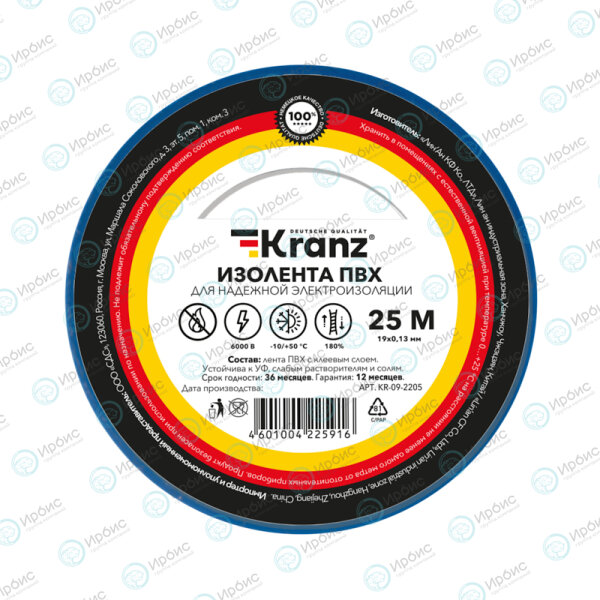 Изолента 0,13х19мм, 25м, синяя, KRANZ KR-09-2205