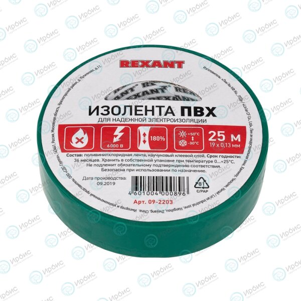 Изолента 0,13х19мм, 25м, зеленая, REXANT 09-2203