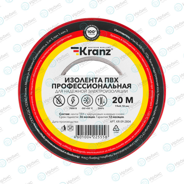 Изолента 0,18х19мм, 20м, красная, KRANZ KR-09-2804
