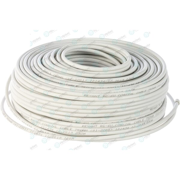 Кабель коаксиальный RG-6U (75 Ом) считается самым распространенным решением для подключения телевизионных систем. Обеспечивая передачу аналоговых сигналов, этот кабель применяется для прокладки внутри помещений в составе распределительных ТВ-сетей. Коаксиальный кабель RG-6U (75 Ом) белый REXANT по структуре представляет собой два проводника – внутренний и внешний, расположенных соосно и разделенных изолирующим диэлектриком. Центральный проводник – однопроводная омедненная жила- окружен изоляцией из вспененного полиэтилена. Экран, наложенный на сердечник, имеет дополнительную алюминиевую оплетку из 48 нитей для обеспечения его электрической непрерывности. Сплошная внешняя оболочка изготовлена из ПВХ и имеет белый цвет. Номинальное волновое сопротивление данного кабеля составляет 75 Ом.