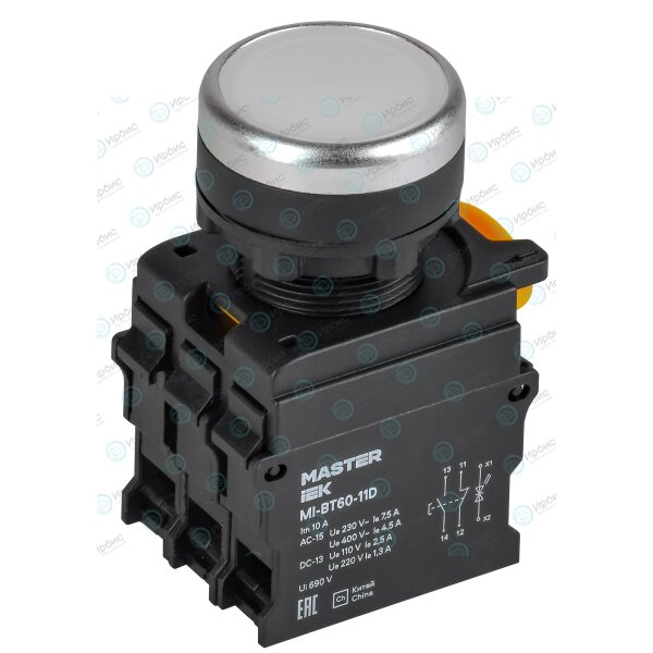 Кнопка с подсветкой d=22мм 1NO+1NC белая MASTER IEK
