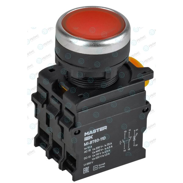 Кнопка с подсветкой d=22мм 1NO+1NC красная MASTER IEK