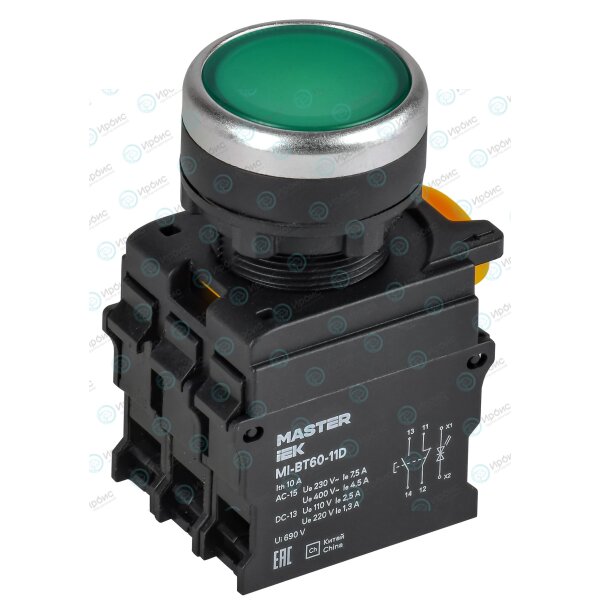 Кнопка с подсветкой d=22мм 1NO+1NC зелёная MASTER IEK