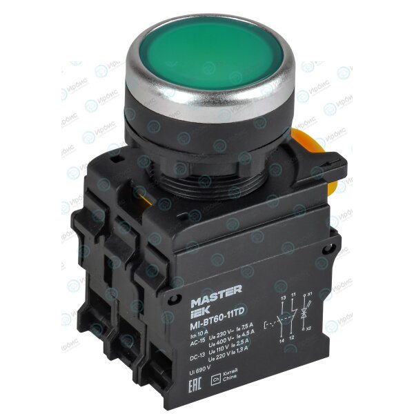 Кнопка с подсветкой и фиксацией d=22мм 1NO+1NC зелёная MASTER IEK