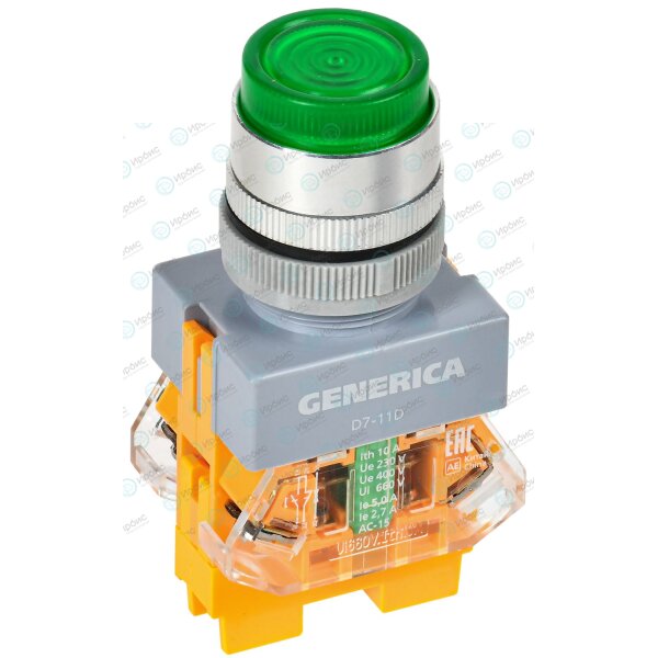 Кнопка управления D7-11D d=22мм 1NC+1NO с подсветкой зеленая GENERICA